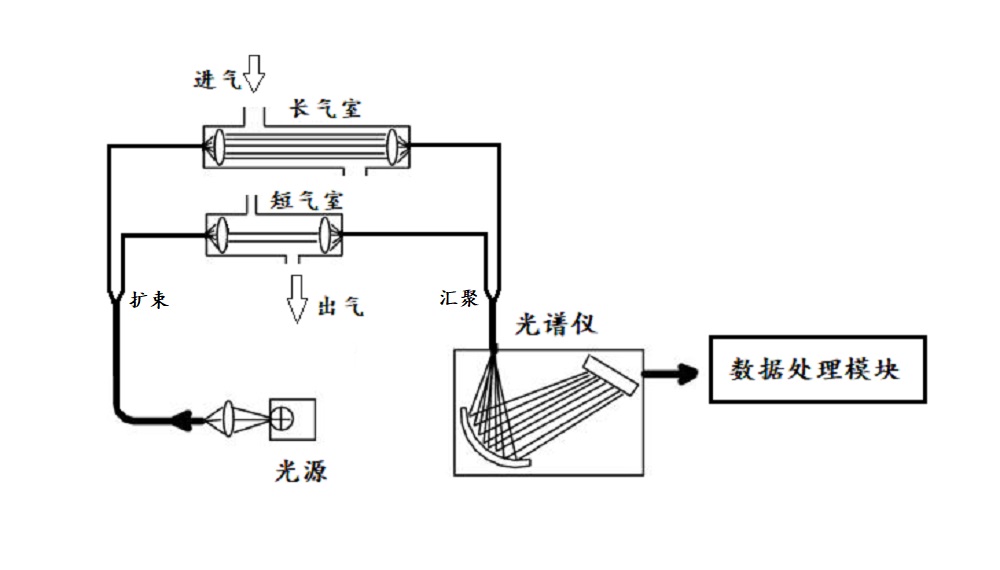 紅外光學傳感部分由紅外光源、長光室、短光室、紅外光譜儀等光學組件構成,光源發出的紅外光由擴束器分光進入兩個氣室,光分別穿透氣室后由匯聚器收光一起進入紅外光譜儀進行探測。最后將數據送入數據模塊進行分析,可以得出氣體中相關組分的濃度。